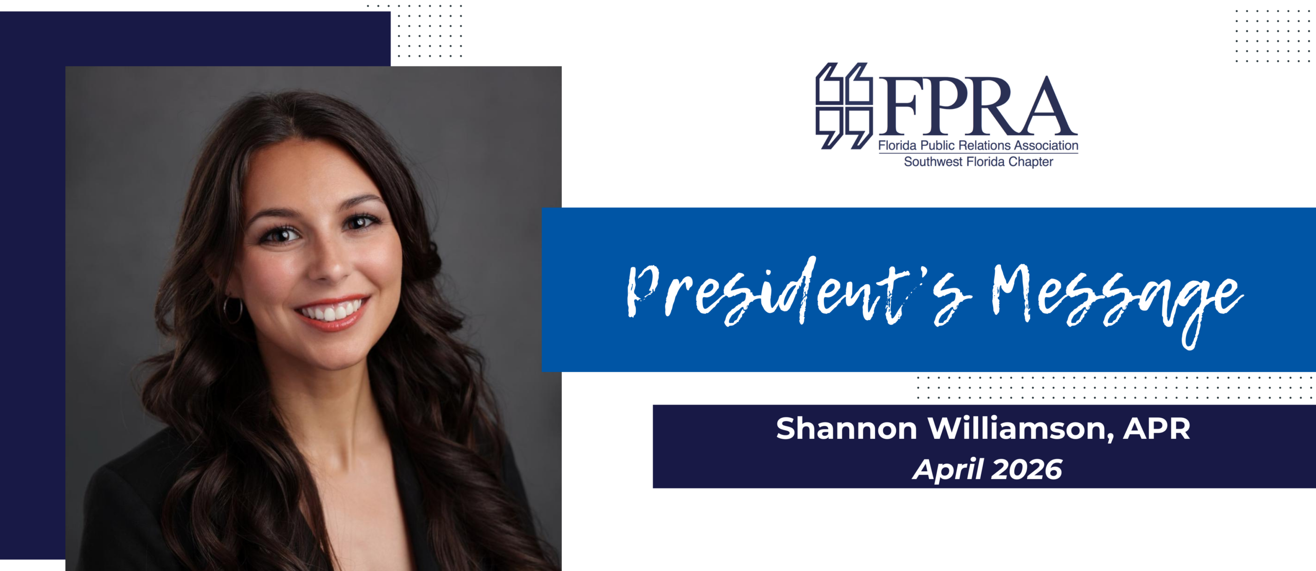 Speaking of giving back… I want to take a moment and thank all who came out to the Soaring Connections event. A special thank you to the team who made it such a success; Lauren Bernaldo, APR, CPRC, Kara Winton, APR, CPRC, Jada Bigord and Violet Powell. The connections made, conversations sparked, and sense of community built are exactly what FPRA is all about. Supporting the next generation of communications professionals is an investment in the future of our industry.